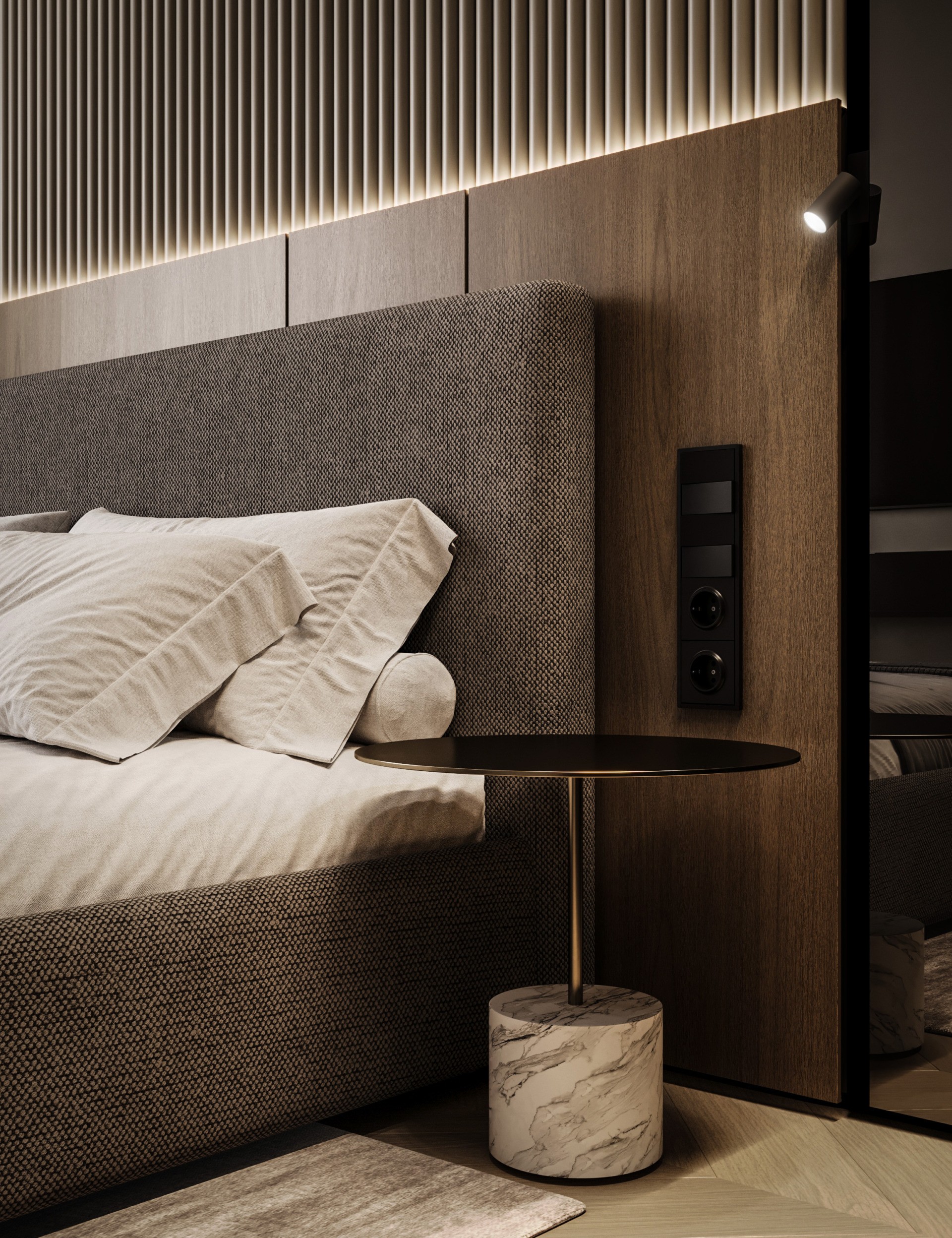 Проект представляет собой современный интерьер с использованием высококачественных натуральных материалов и тёплой цветовой гаммы. Полы выложены кварцвиниловым ламинатом в формате «шеврона» и крупноформатным керамогранитом. Для отделки стен применены декоративная штукатурка с замшевой текстурой, покраска и инновационный материал – бамбуковые панели с древесной текстурой. Установлены скрытые распашные двери.